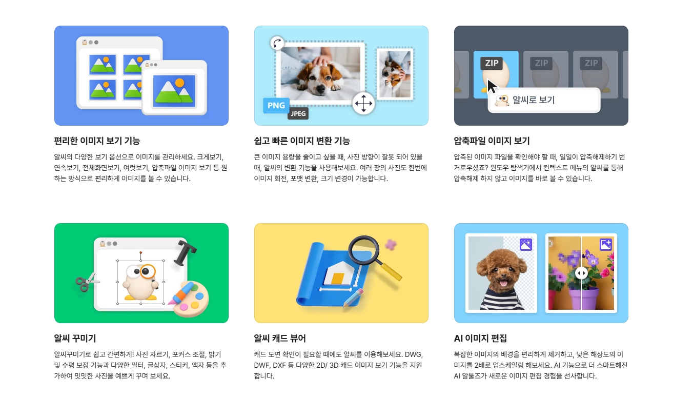 첫째, 알씨는 다운로드 후 바로 실행할 수 있어 웹사이트 접속이나 파일 업로드 없이 즉시 작업을 시작할 수 있습니다.
