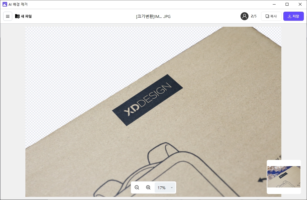3. 몇 초 내로 배경 제거가 완료되며, 결과물을 확인할 수 있습니다. 이때 배경이 제거된 이미지를 비교하거나 저장할 수 있습니다.