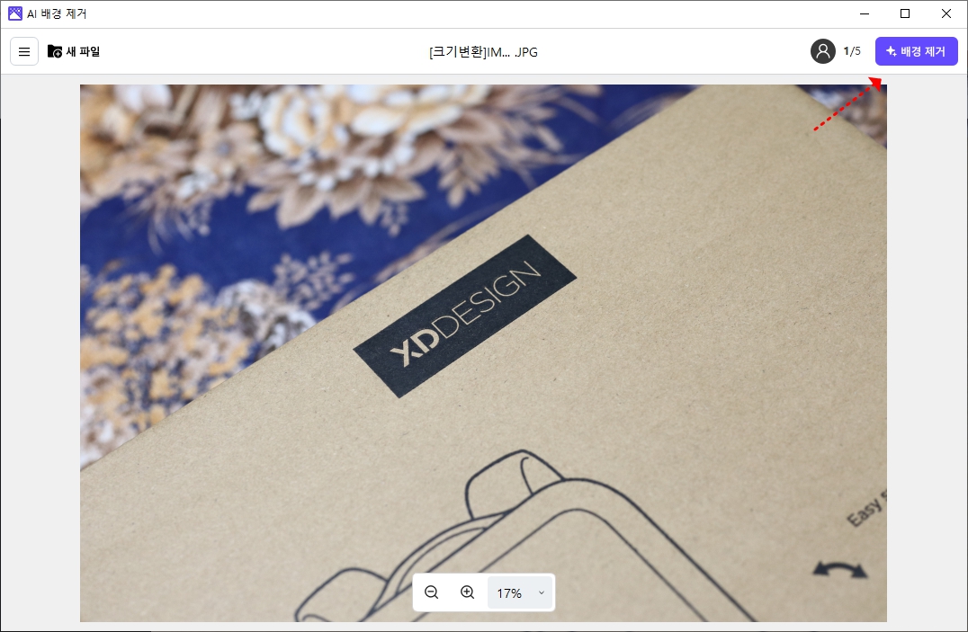 2. 배경을 제거할 이미지를 불러온 후, 상단의 ‘AI 배경 제거’ 버튼을 클릭합니다.