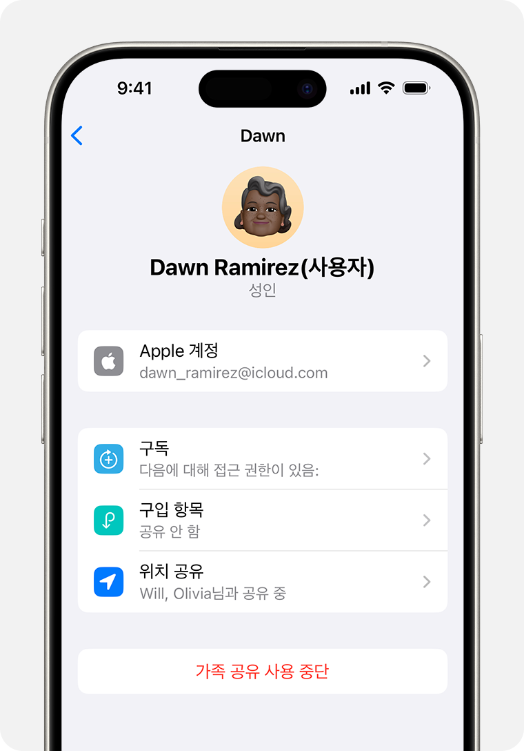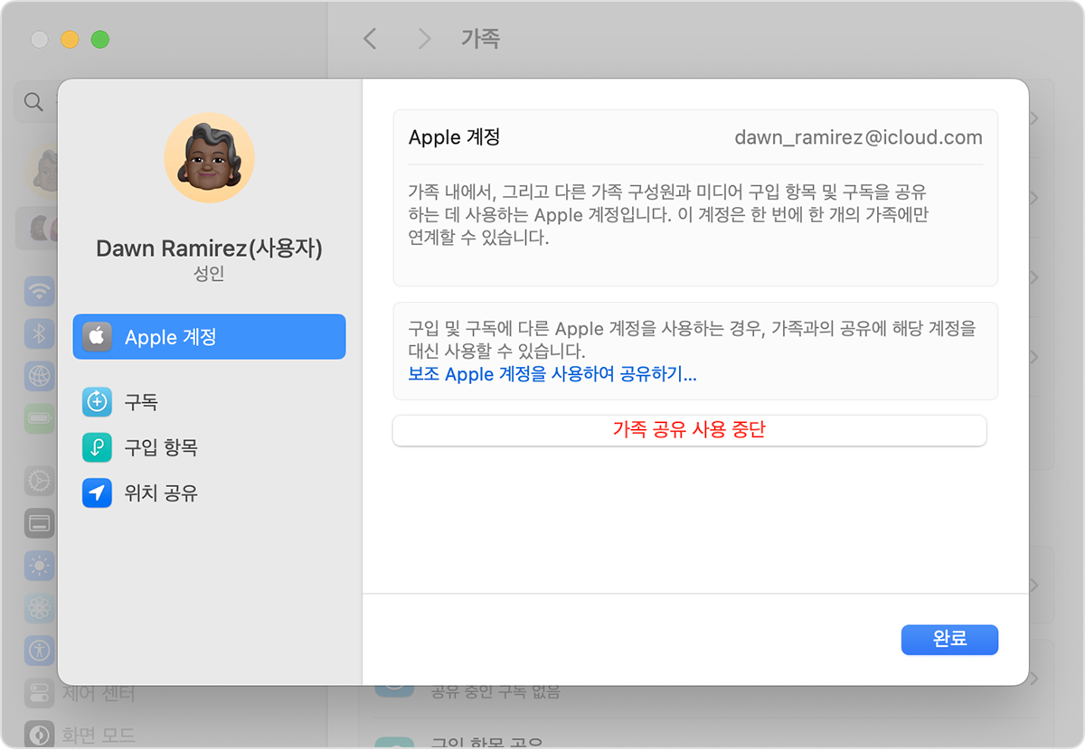 우선 설정에서 본인의 이름을 누르고 가족 공유 항목에서 "가족 공유 사용 중단"을 선택하면 됩니다.