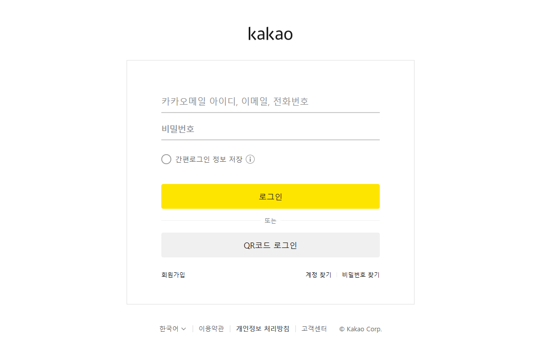 카카오 로그인 페이지에 접속하면 하단 왼쪽에 있는 "회원가입" 버튼을 클릭합니다.
