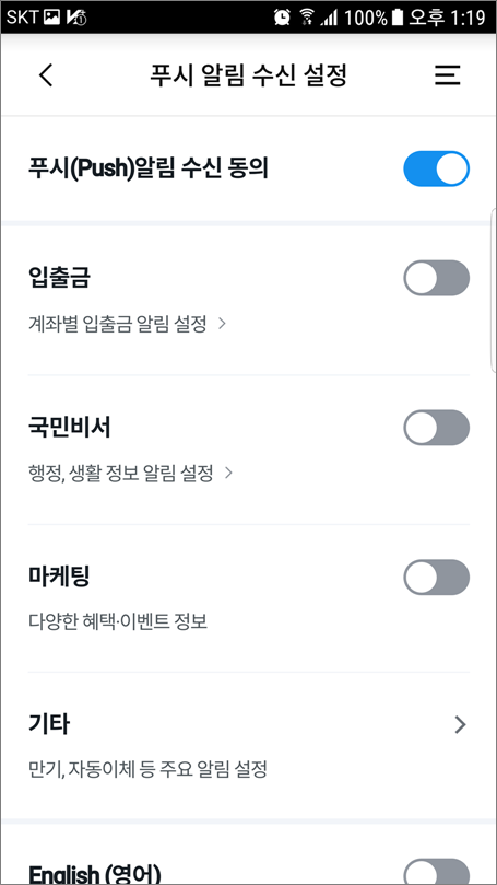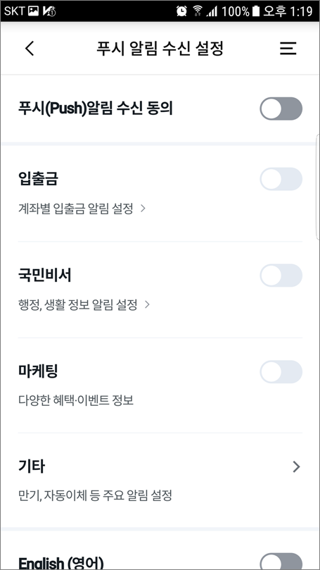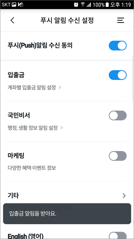SMS 입출금통지 서비스도 해지할 수 있으며, 동일한 방법으로 설정에서 해지할 수 있습니다.