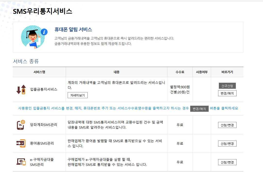 - 서비스 신청: ‘부가서비스’ 메뉴에서 ‘SMS 입출금 통지 서비스’를 선택하여 서비스 신청을 진행합니다.