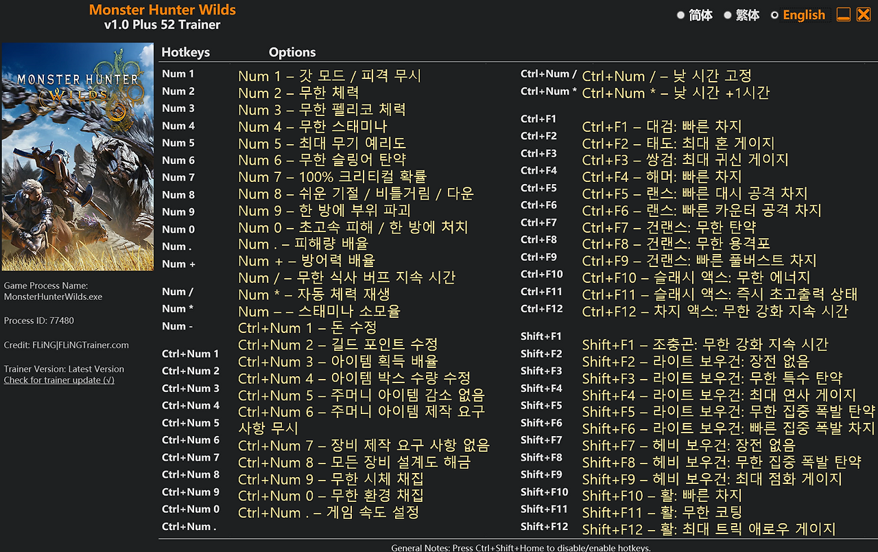 최근 가장 안정적이고 인기 있는 트레이너는 최신 버전 Monster.Hunter.Wilds.v1.0.Plus.61.Trainer-FLiNG을 사용하는 것이 좋습니다.