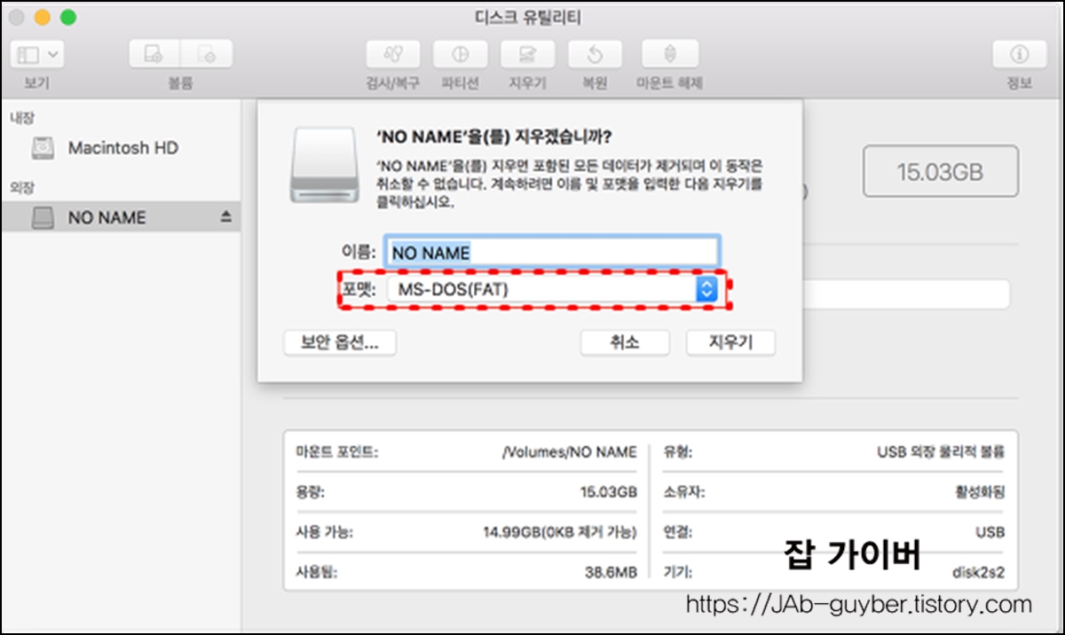 하지만 포맷 타입을 MS-DOS(FAT)으로 지정해주세요.