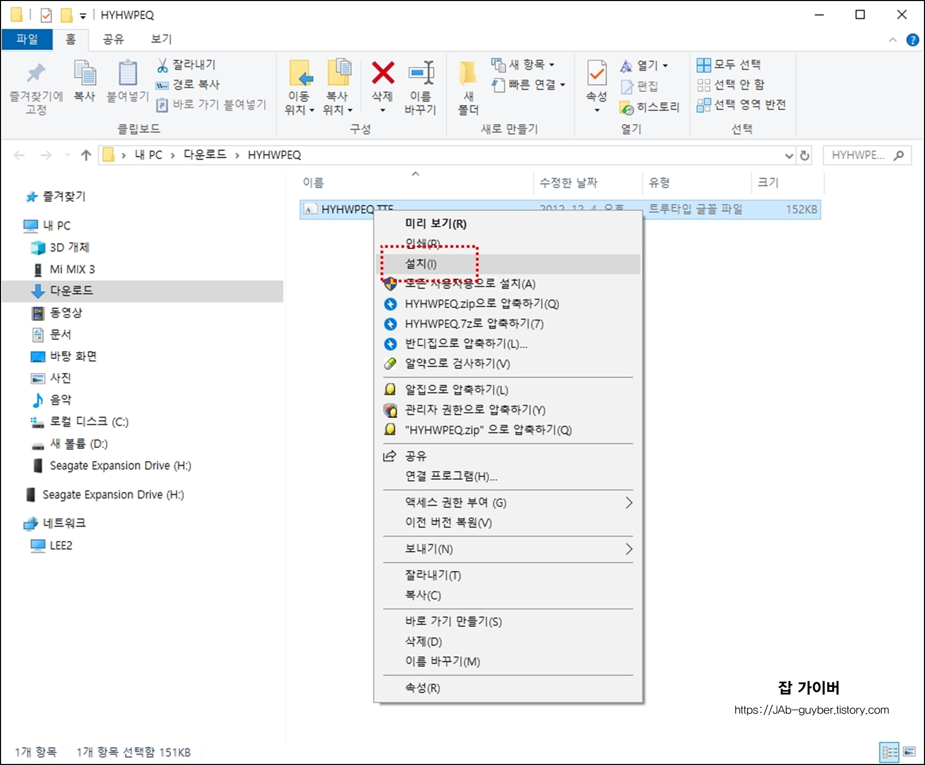 - 그리고 폰트를 선택하고 마우스 우 클릭을 하면 목록중에 설치가 보이며 클릭을해줍니다.