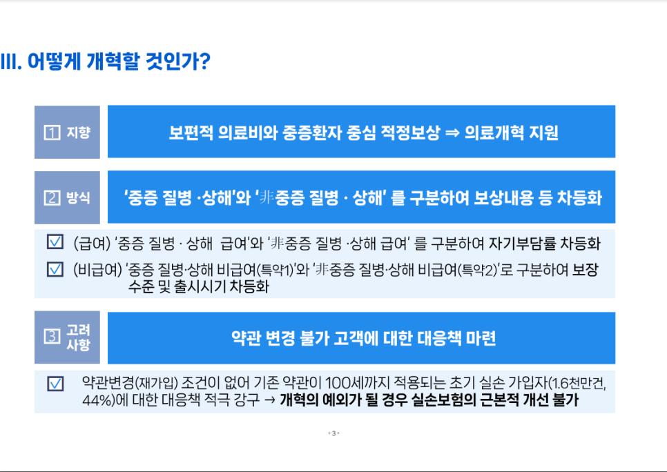 - 미등재 신의료기술 등 → 보험 청구가 잦고 과잉진료가 우려되던 항목은 아예 보험 보장 대상에서 제외됩니다.