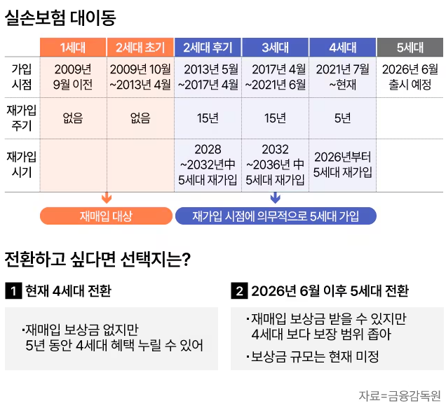 다만, 5세대로 자발적으로 전환할 경우 인센티브(보상금)를 제공하는 '재매입 제도'를 도입할 계획이기 때문에, 본인의 의료 이용 패턴과 보험료 부담 등을 따져보며 전환 여부를 결정하는 것이 좋습니다.
