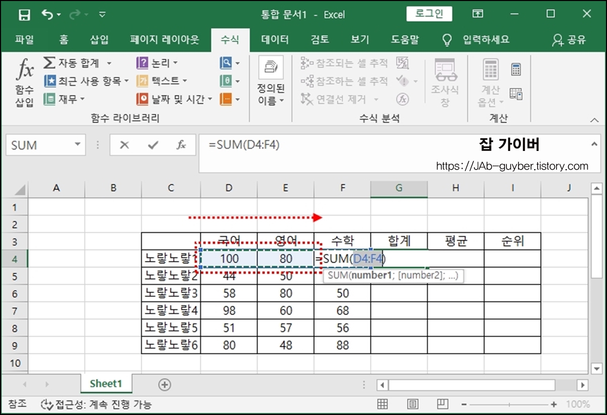보는것과 같이 국어와 영어 수학 부분의 셀을 마우스를 드래그해서 선택 후 엔터를 누르면 노랗노랗1에 대한 국어 영어 수학의 합계 점수가 나옵니다.