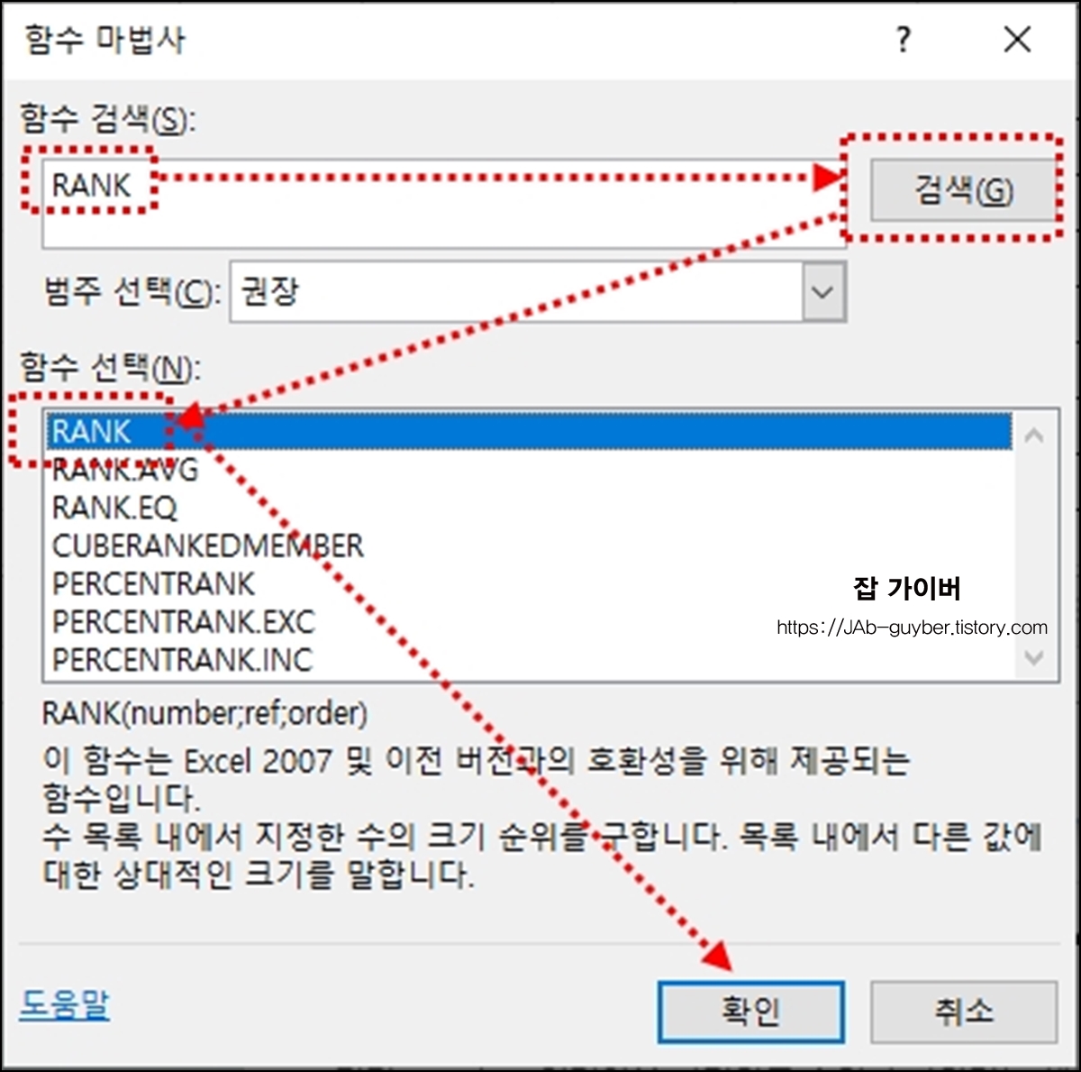 기타함수를 선택후 함수 검색에 Rank 검색합니다.