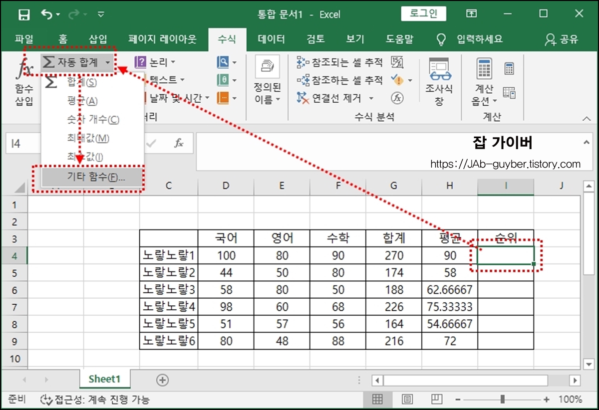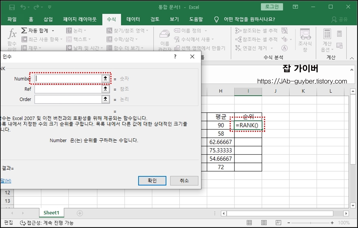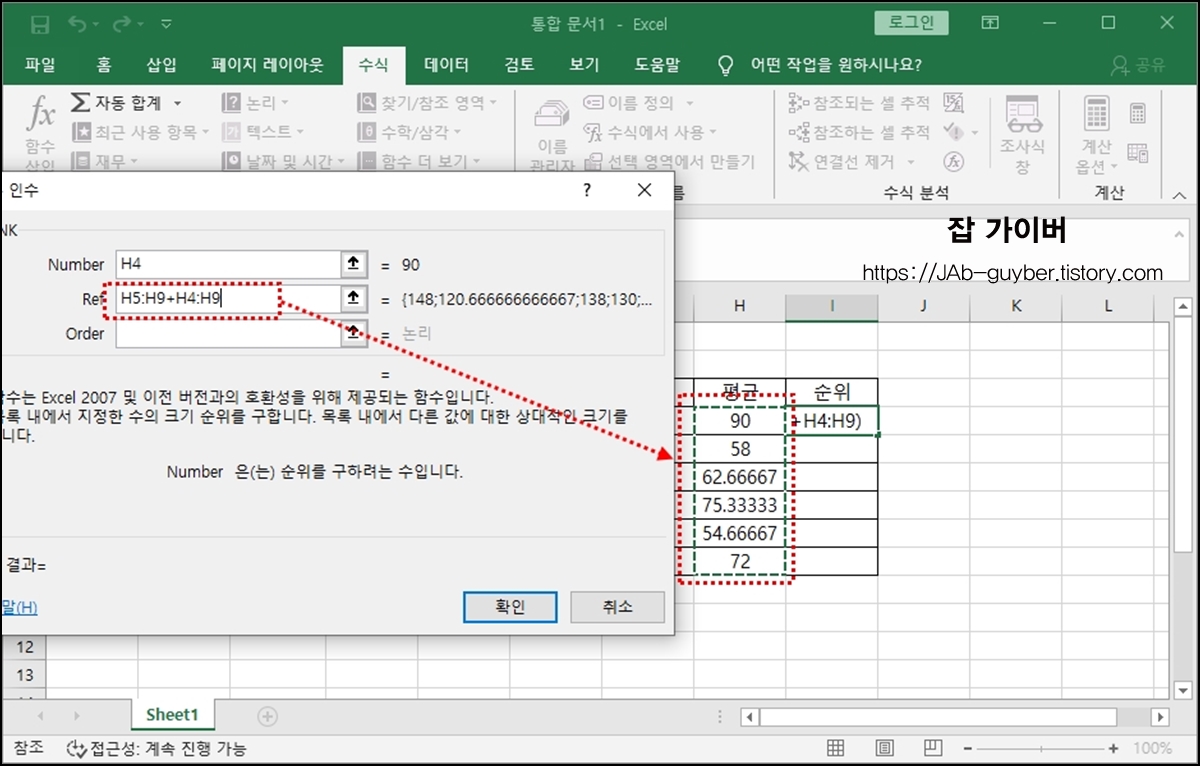엑셀 더하기 평균 순위 수식 함수 사용방법