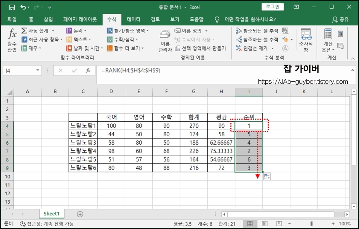 엑셀 순위 수식 함수