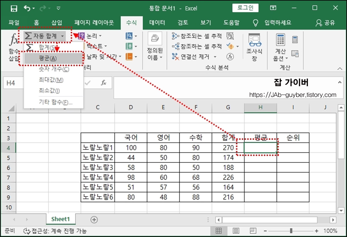 평균 부분에 셀을 선택 후 수식 -> 자동 합계 옆의 화살표를 선택 후 평균을 선택합니다.