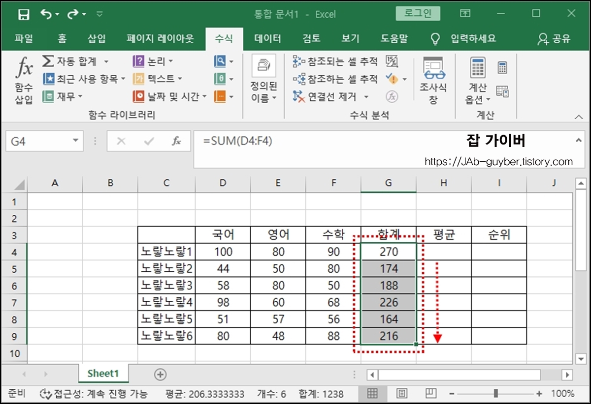 보는것과 같이 국어와 영어 수학 부분의 셀을 마우스를 드래그해서 선택 후 엔터를 누르면 노랗노랗1에 대한 국어 영어 수학의 합계 점수가 나옵니다.