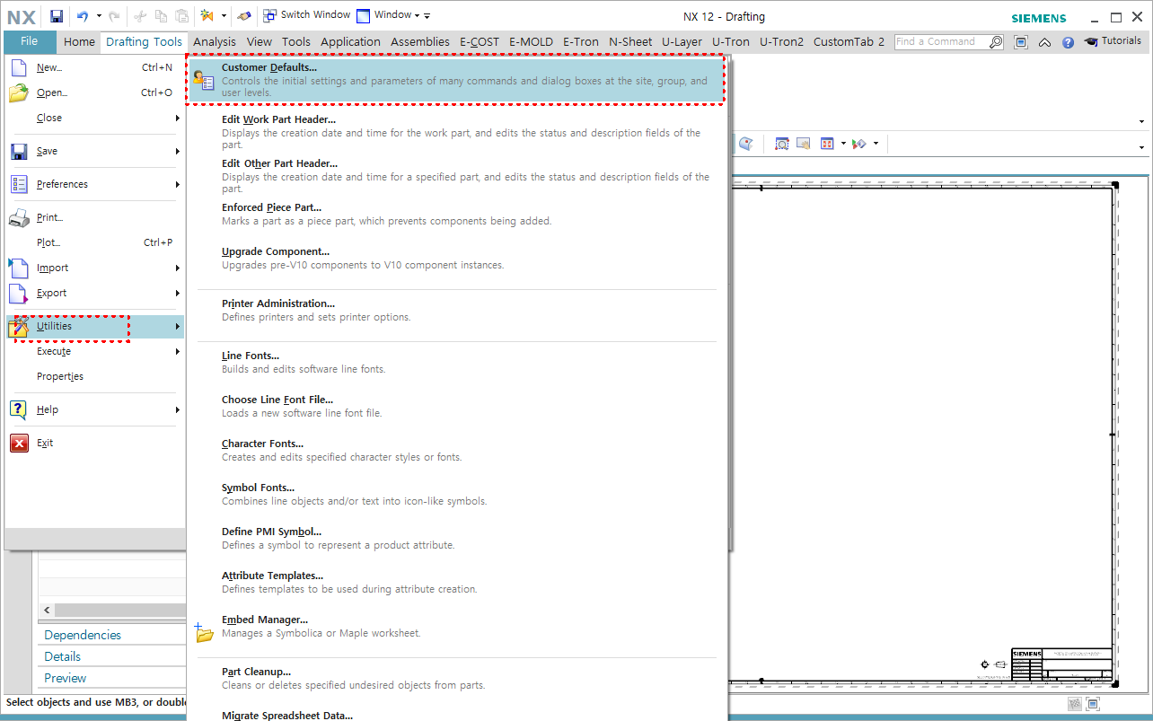 다음 NX 실행 후 Custormer Defaults "커스텀 디폴트"를 실행 후 Geteway - > Reuse Library - Symbols Library 경로로 이동합니다.