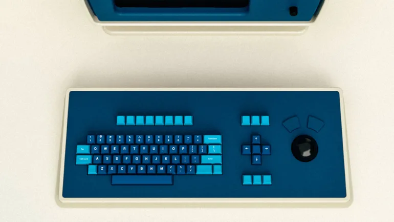 첫눈에 들어오는 선명한 파란색 키캡과 더티 화이트 프레임의 대비는 특유의 레트로 감성을 현대적으로 재해석한 디자인 언어입니다. 특히, 과감히 ESC 키와 Control, Option 키 등을 생략한 결정은 단순한 스타일적 선택이 아니라 드라마 속 기업인 루몬 인더스트리의 권위적이고 억압적인 컨셉을 충실히 반영한 디자인입니다.