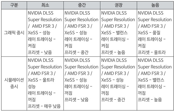 그래픽 설정은 '그래픽 중시'와 '시뮬레이션 중시'로 나뉘며, 사용자의 성향에 따라 선택 가능합니다.