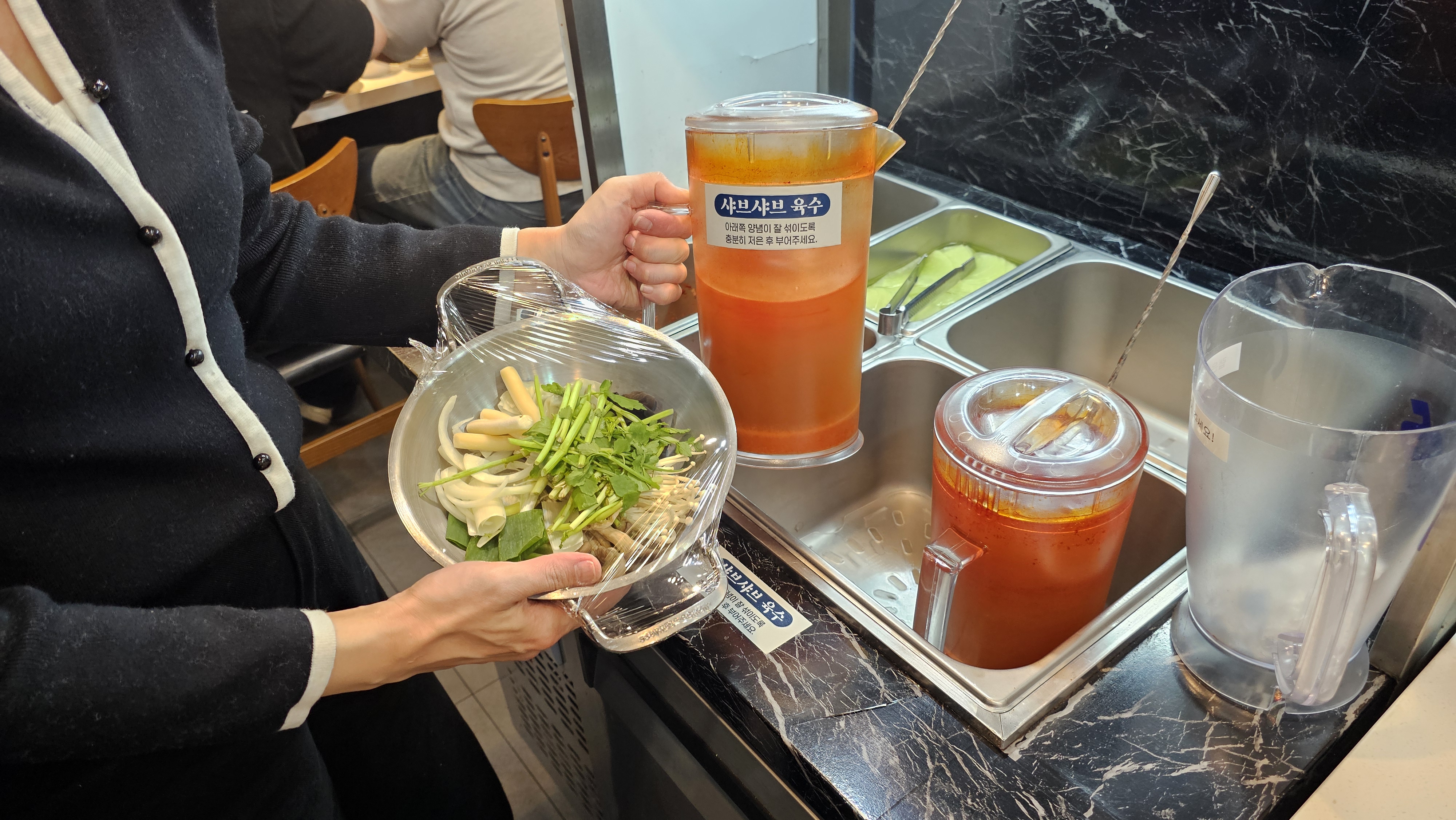 셀프바에 안내된 대로 얼큰육수를 샤브샤브 냄비에 붓고 샤브샤브용 고기를 몇 점 넣었다. 육수가 막 끓기 시작할 때가 가장 깔끔하고 깊은 맛을 낸다는 안내대로, 고기 한 점을 먹어보니 느끼함을 잡아주는 얼큰하고 개운한 맛이 일품이었다.