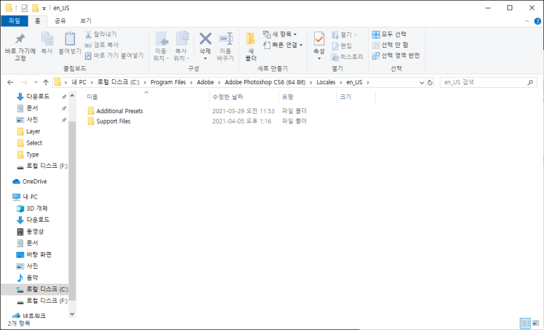 - 파일 이름 변경 후 포토샵을 실행하면 한글 인터페이스로 바뀌어 있는 것을 확인할 수 있습니다.