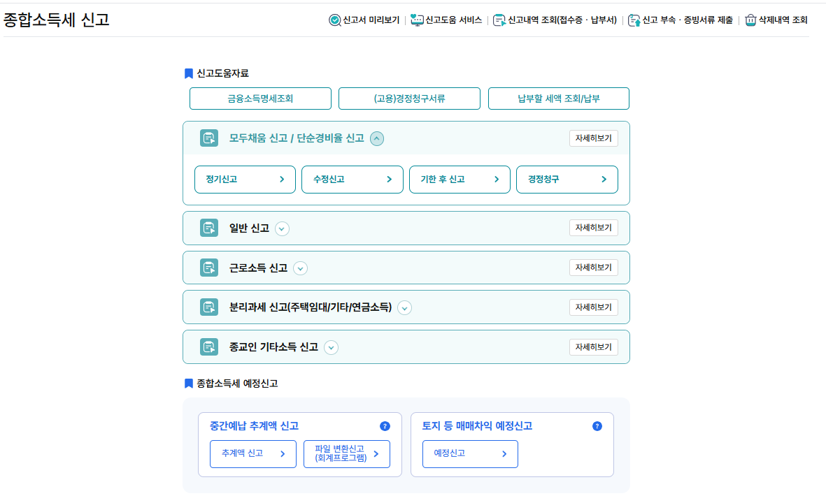 홈택스 상단의 ‘맞춤형 신고도움 서비스’를 이용하면 신고 유형 판별이 가능하며, 소득자료도 자동 불러오기를 통해 일부 편리하게 확인할 수 있습니다.