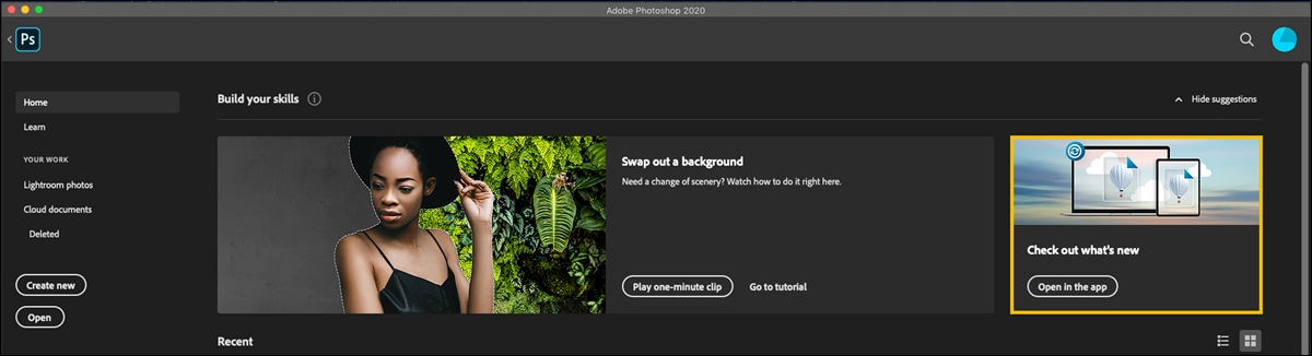 포토샵 CC 2020 새로운 기능에 대한 개요를 알려면 홈 화면으로 이동한 다음, 오른쪽의 앱에서 열기를 클릭하십시오.