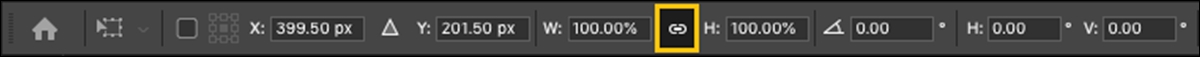 - 이제 기본 변형 동작은 모든 레이어 유형 및 개체에 대해 비례적 크기 조절이며 종횡비를 유지합니다 단추(링크 아이콘)가 [옵션] 막대에서 [켬] 상태로 표시됩니다.