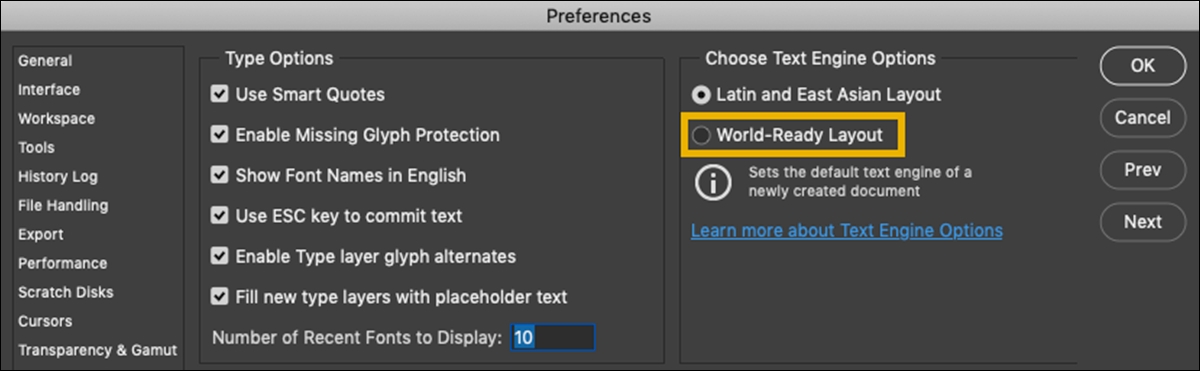 이 옵션을 선호하는 텍스트 엔진 옵션으로 설정하려면 편집(Win)/Photoshop(Mac) > 환경 설정> 문자를 선택한 다음, 텍스트 엔진 옵션 선택 아래의 세계 통용 레이아웃을 선택하십시오.