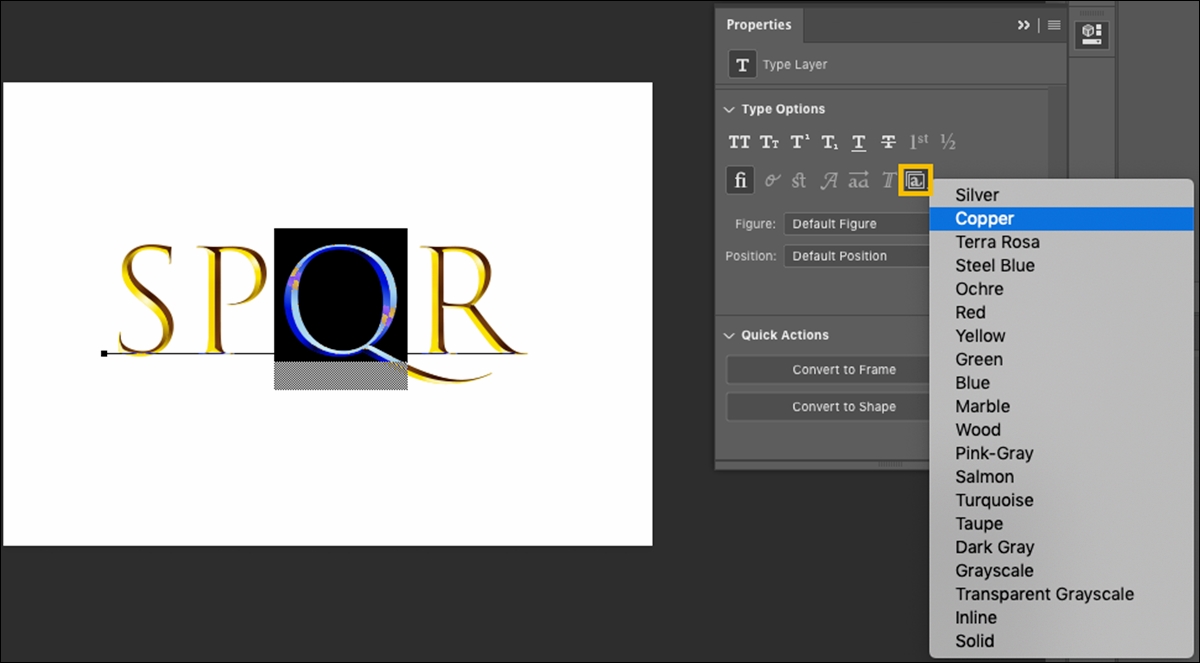 - 레이어 패널에서 하나 이상의 문자 레이어를 선택합니다.