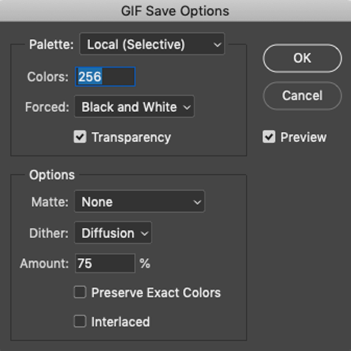 파일 > 다른 이름으로 저장 옵션으로 저장할 때 GIF 저장 옵션 대화 상자에 나타나는 모든 옵션이 애니메이션 GIF를 작성하는 데 지원됩니다.