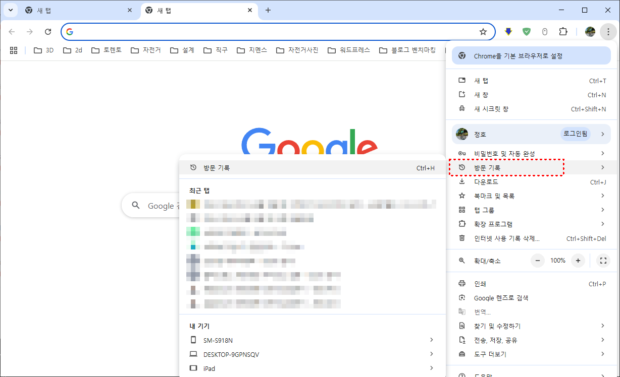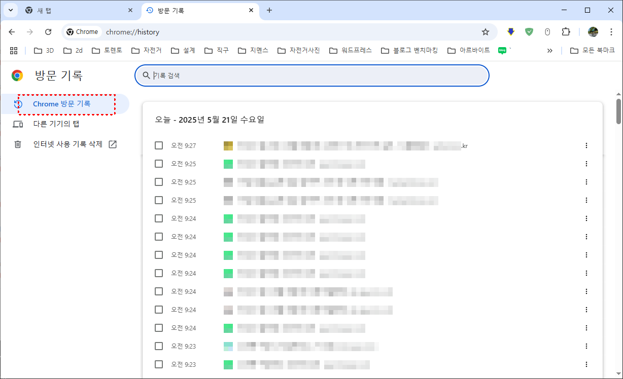 탭이 너무 많아 어떤 걸 닫았는지 기억이 나지 않는다면, 방문기록(History)에서 직접 찾는 것이 더 확실합니다.