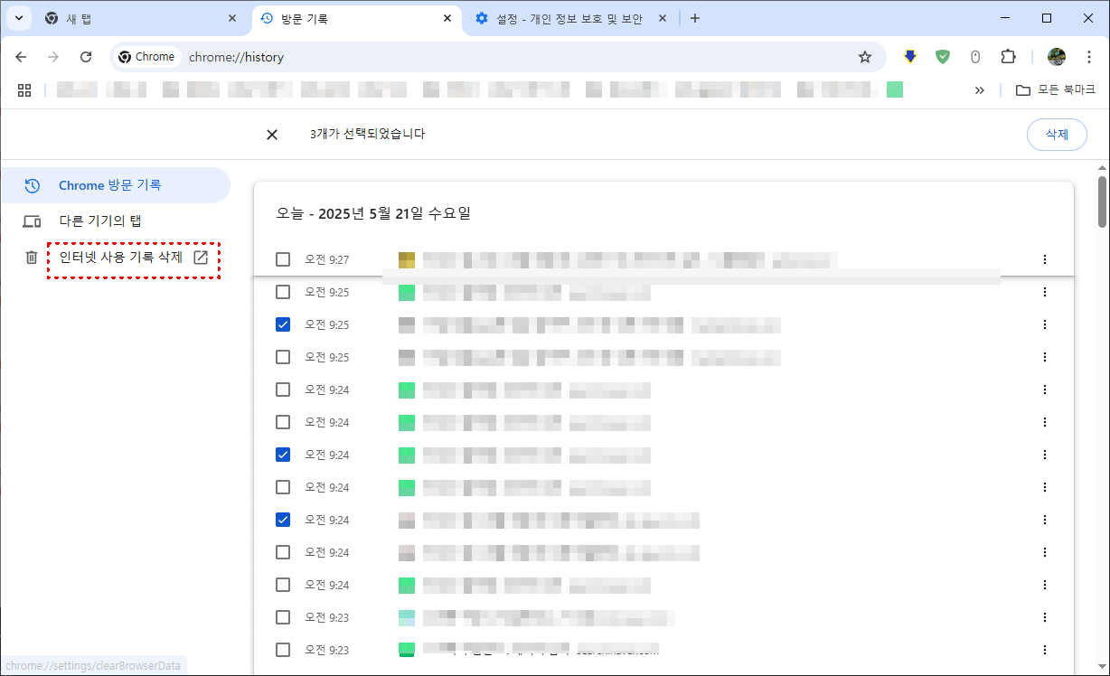 이 기능은 공용 PC나 공유 계정에서 사생활 보호를 위한 필수 작업입니다.