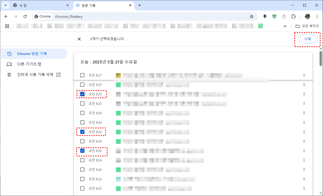 2. 삭제할 항목을 개별 선택하거나 날짜별로 필터링