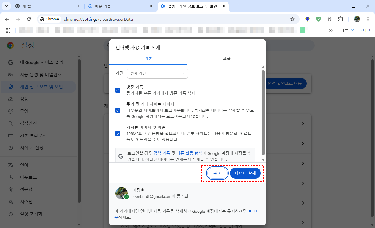 4. 삭제 범위(최근 1시간, 전체 등) 및 항목(방문 기록, 캐시, 쿠키 등)을 선택