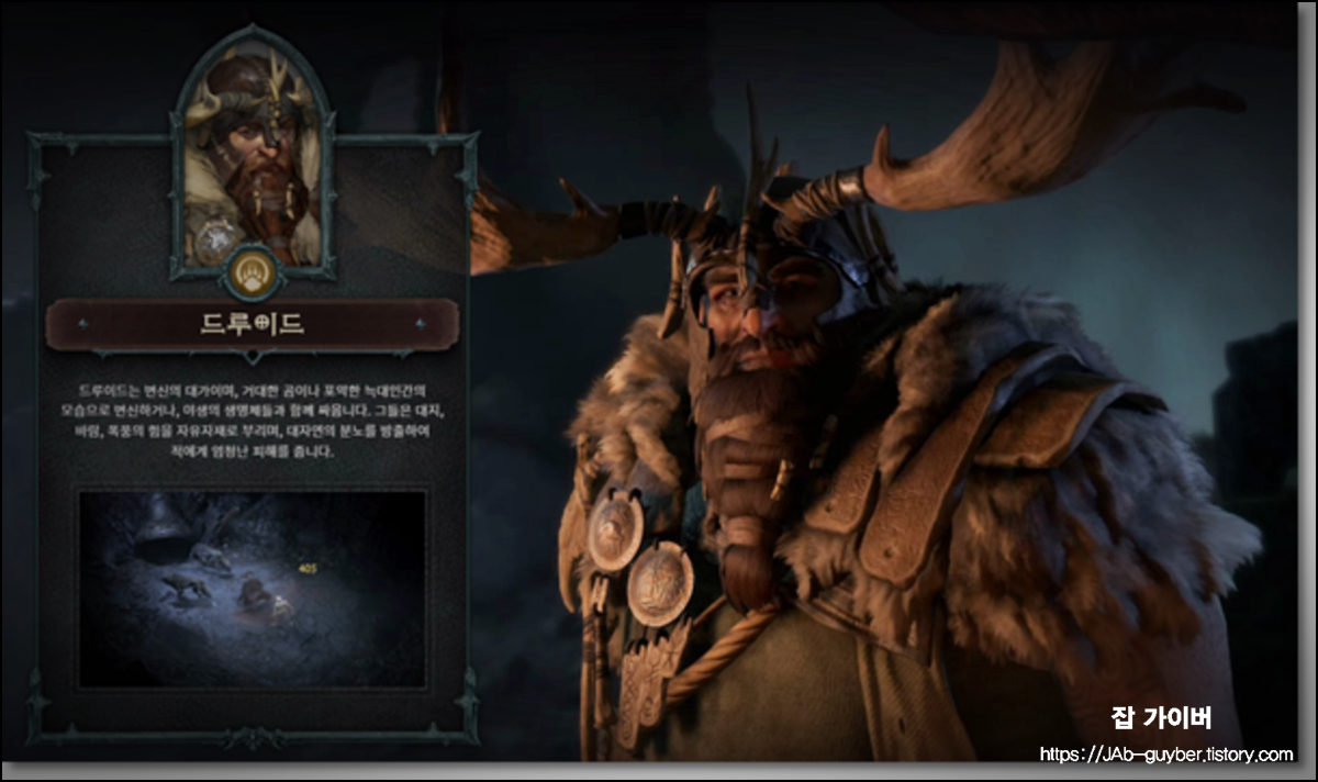 원소술사, 드루이드, 야만용사 3개의 직업 클래스가 보입니다.