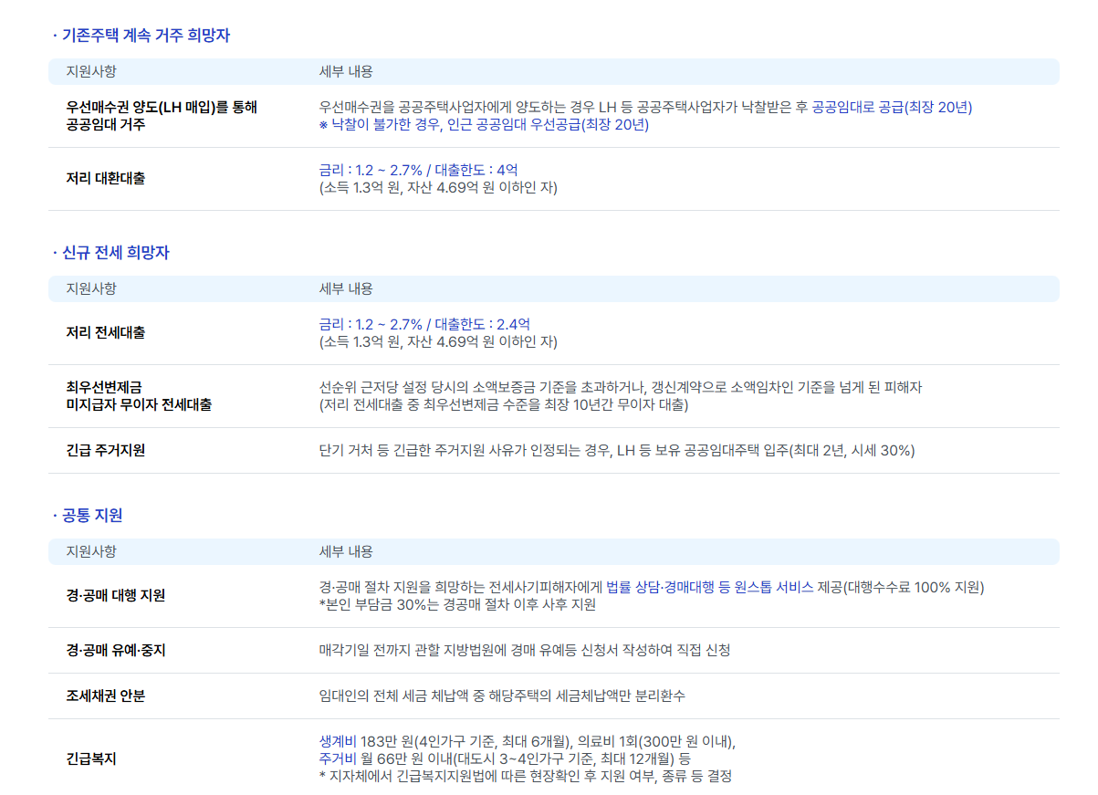 저리 대출, 우선매수권, 법률지원, 경·공매 대행, 긴급복지 지원, 재산세 감면, 임대료 감면 등 다양한 주거 및 금융지원이 마련되어 있으며, 무주택자에게는 추후 공공임대 매입 기회도 부여됩니다.