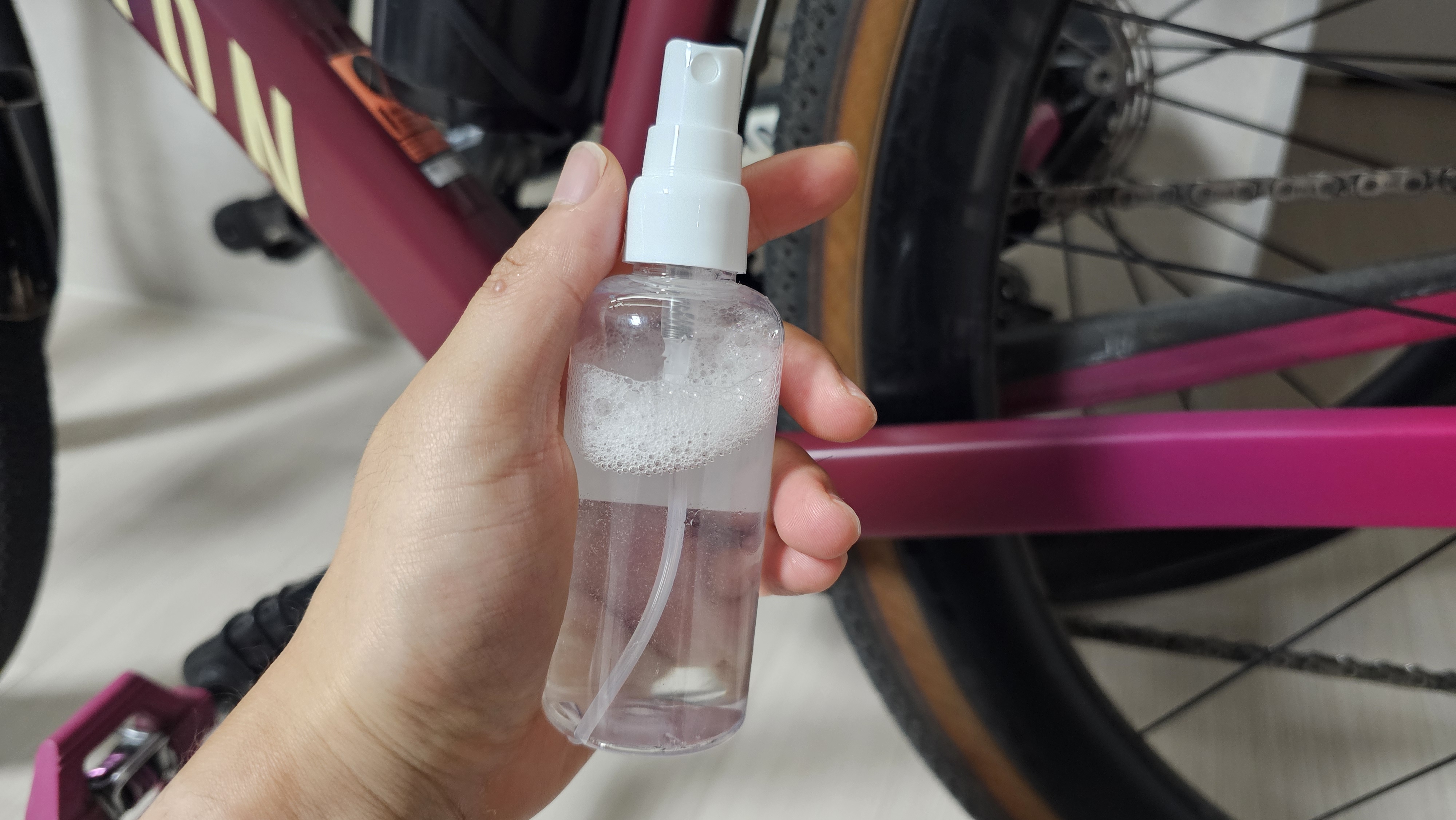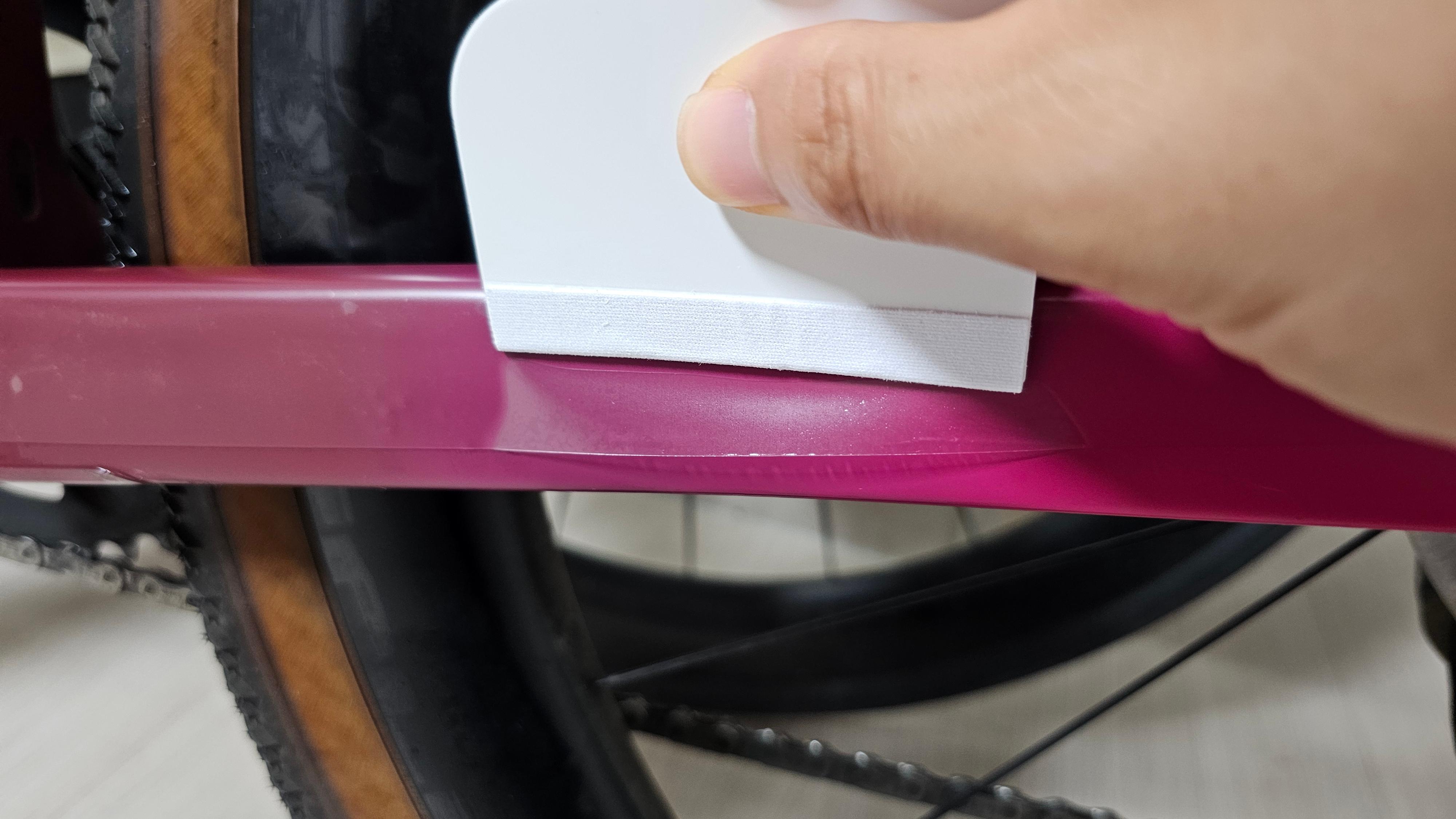 우선 자전거 프레임을 마른 천으로 깨끗하게 닦고, 동봉된 용기에 물을 뿌린 다음 필름을 부착하면 끝. 마지막으로 밀착만 꼼꼼히 해주면 건조되면서 완벽하게 고정됩니다. 저는 하루 정도 건조 시간을 두고 탑승했어요.
