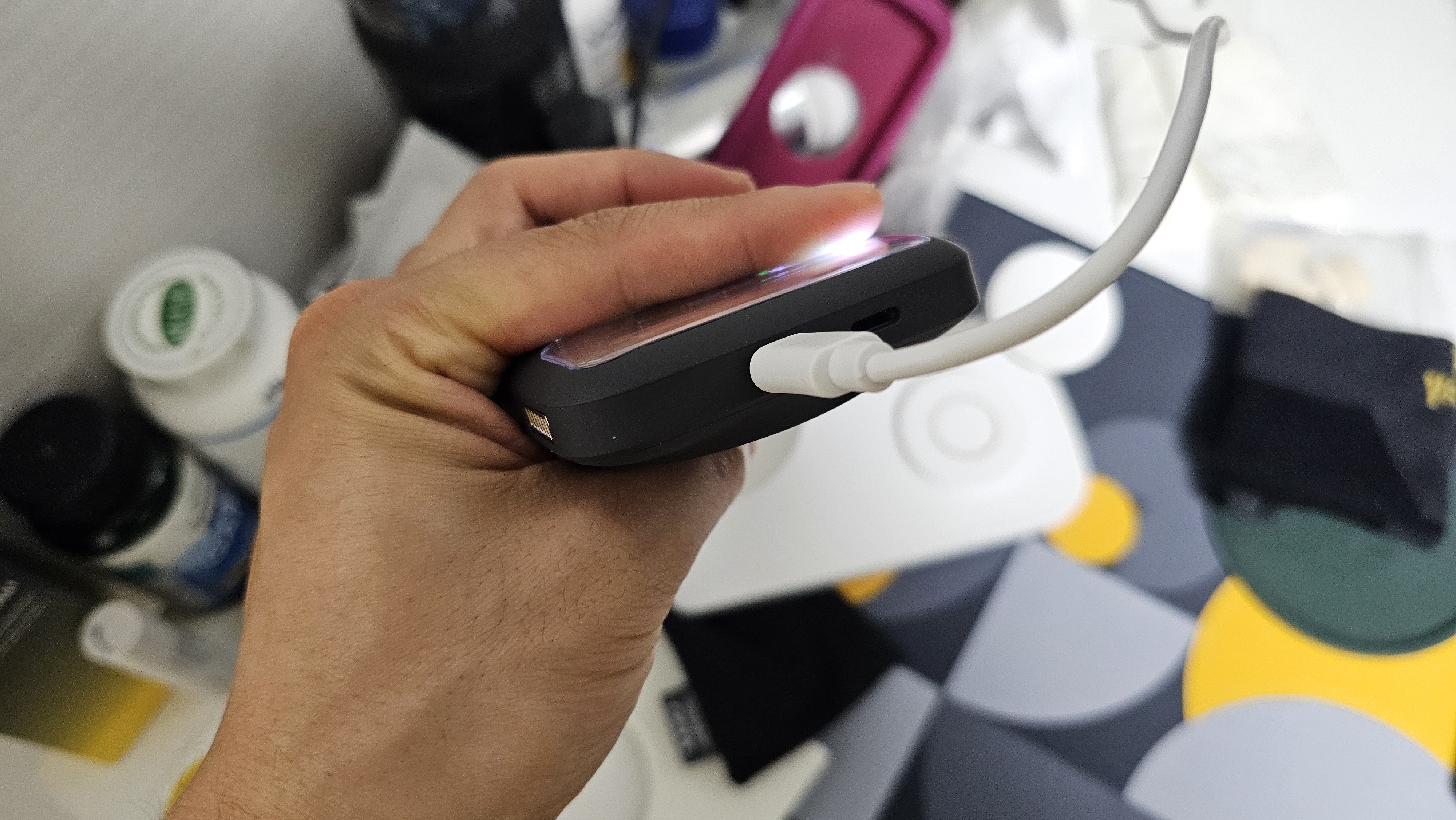 디자인은 깔끔하고 심플한 미니멀 스타일이에요. 크기도 한 손에 쏙 들어오는 정도라 휴대하기 편하고, 저는 블랙 컬러를 선택했는데 매트한 질감 덕분에 지문이 잘 묻지 않고 고급스럽게 보였어요. 민트, 화이트도 있으니 취향 따라 고르시면 좋을 것 같아요.