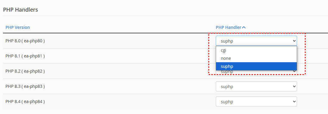 /usr/local/cpanel/bin/rebuild_phpconf --default=ea-php83 --ea-php83=fpm --ea-php84=suphp