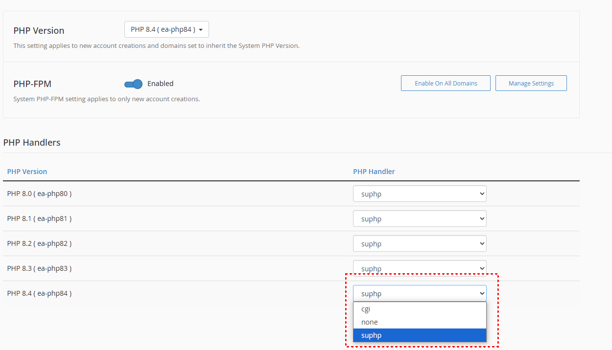 - 여기서 PHP-FPM 옵션이 활성화되어 있는지 확인