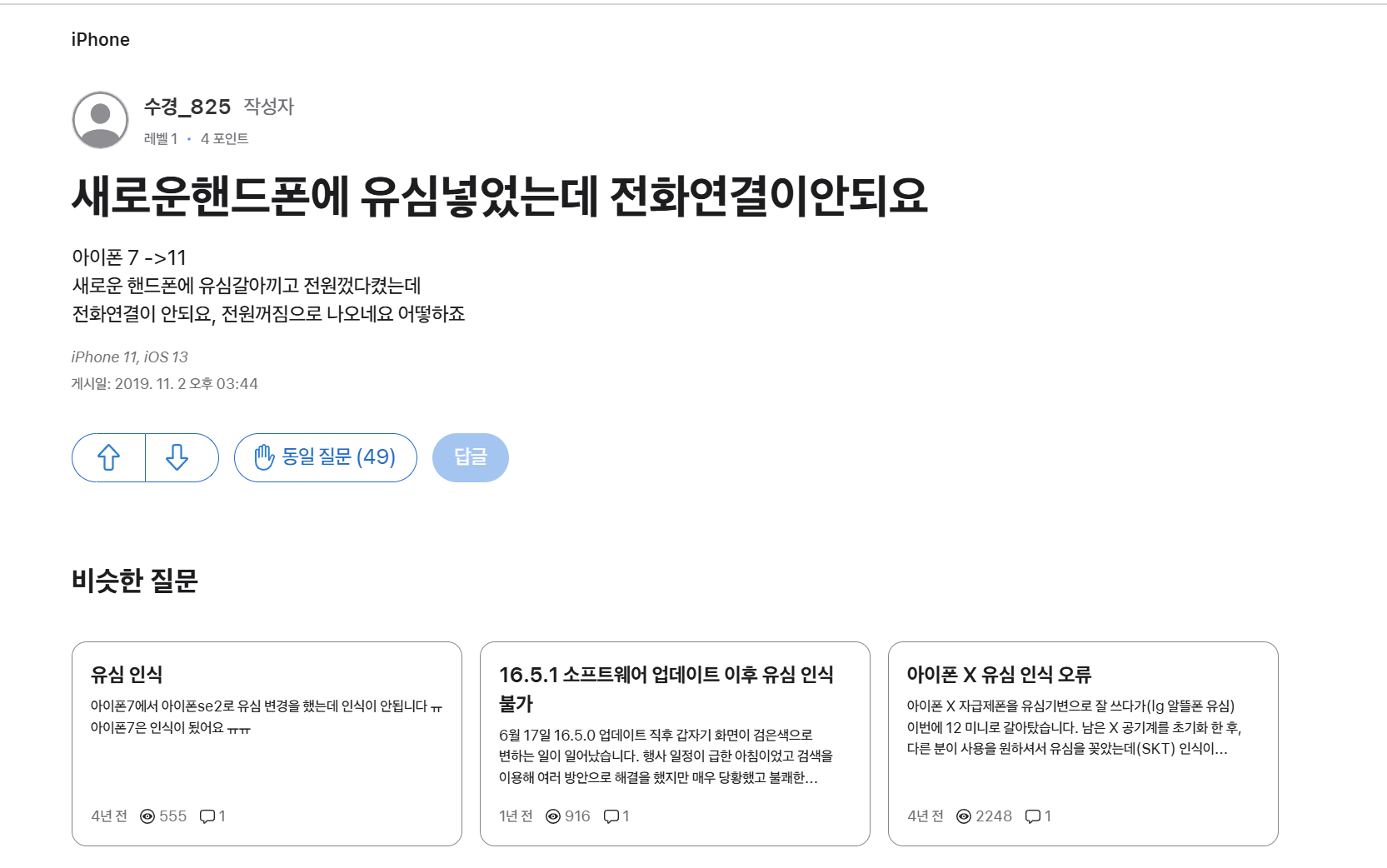 그래서 유심 불량 여부를 확인하기 위해 다른 폰에 유심을 꽂아봤는데, 거기서도 인식이 안 되더군요. 이쯤 되면 거의 확실히 유심 자체의 문제라는 판단이 섰고, 다시 새 유심으로 교체받아서 해결했습니다.