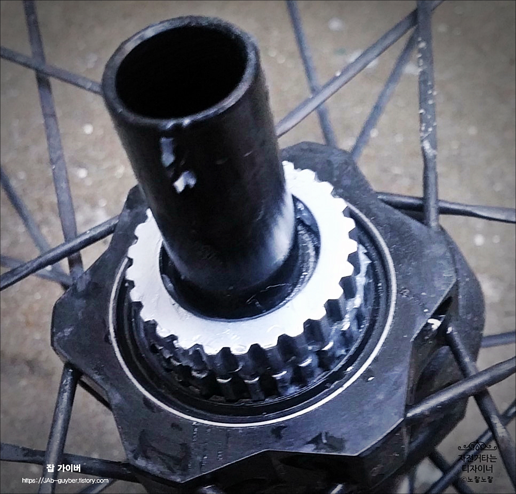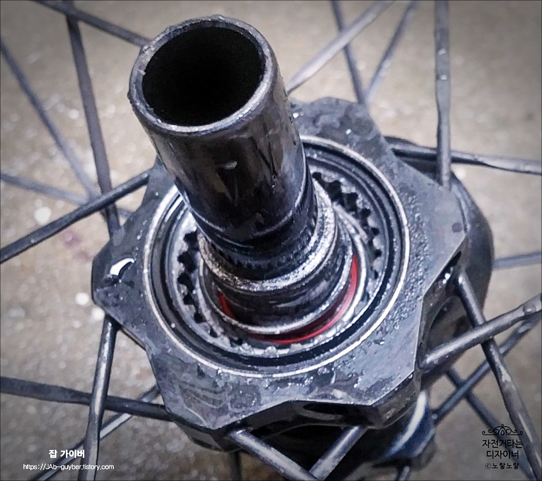 분해를 하지 않고 장착된 상태에서 디그리셔를 뿌리게 되면 허브 안으로 디그리셔가 들어가 허브 안에 구리스를 날려버릴 수 있어요