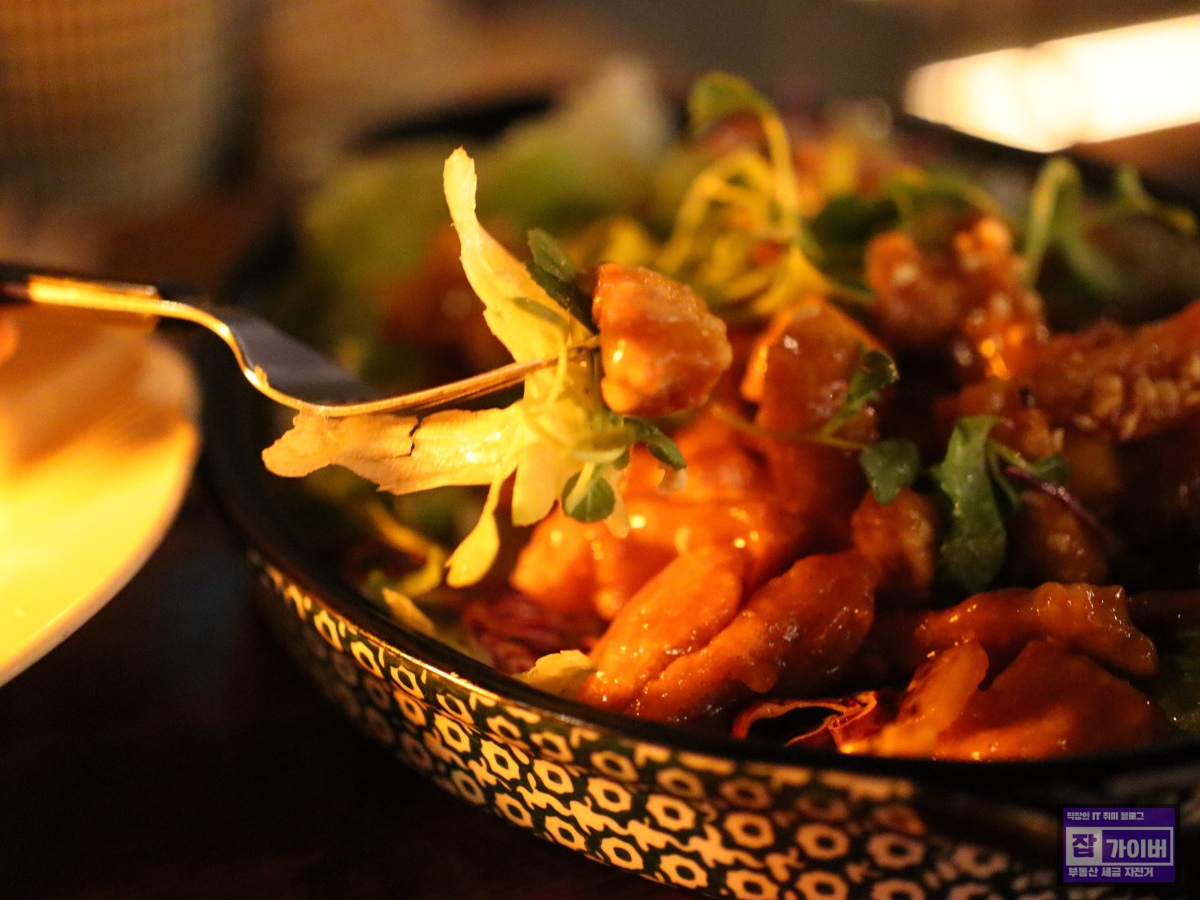 '비건 탕수육이 무슨 맛이 나겠어'라는 생각이 들었지만, 한 조각을 젓가락으로 들어 소스에 묻혀 입에 넣는 순간, 이건 진짜였다. 겉은 놀라울 만큼 바삭했고, 속은 말랑말랑하면서도 결이 살아있었다. 마치 고기를 먹는 듯한 식감인데도 느끼함은 전혀 없고, 채소의 담백함이 중심을 잘 잡고 있었다.