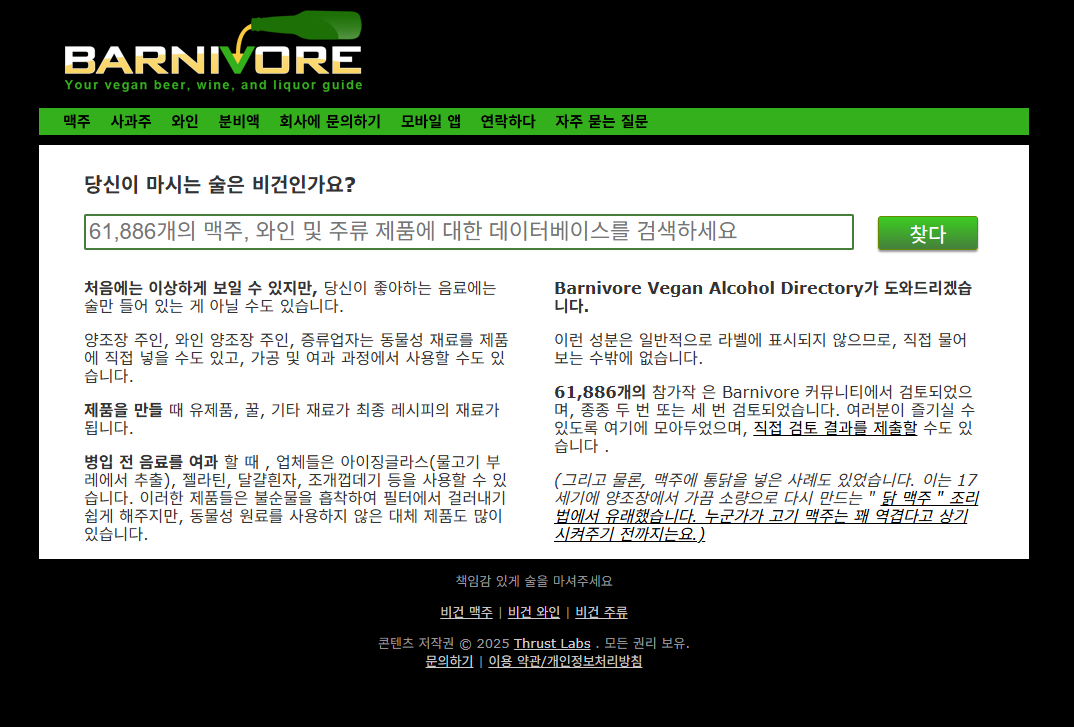 문제는 이런 정보를 제품에 표시하지 않는다는 것. 제품 라벨엔 정제제가 표기되지 않기 때문에 소비자가 직접 알기는 어렵다. 이런 때는 ‘비건편의점 위키’나 ‘Barnivore(바니보어)’ 같은 비건 주류 정보를 모아둔 사이트가 큰 도움이 된다.
