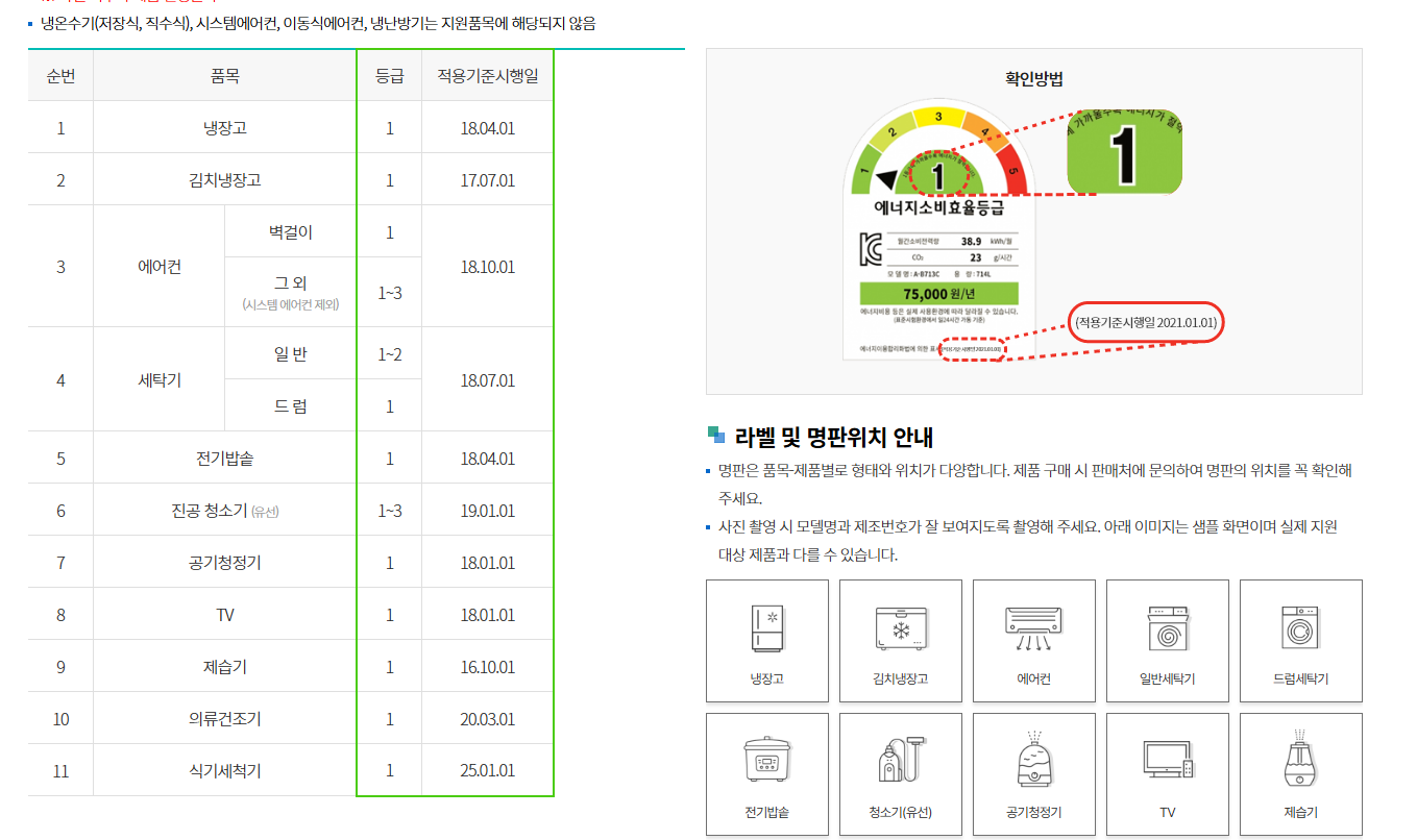 | 구매 장소 | 온·오프라인 모두 가능 (단, 에너지소비효율등급 라벨이 부착된 제품에 한함) |
