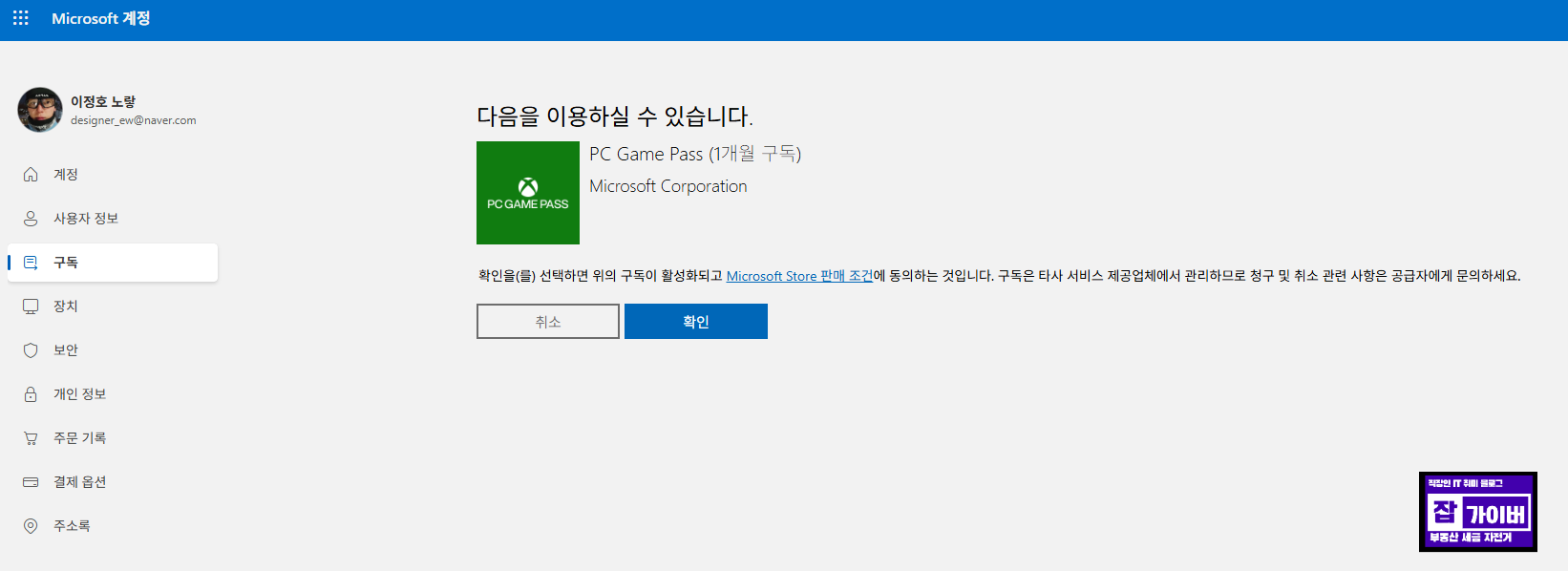 변경을 완료하면 Xbox 게임패스를 받기 위한 링크로 연결됩니다. 여기서 본인의 Microsoft 계정으로 로그인한 뒤, 안내에 따라 1개월 이용권 등록을 진행하면 되며 이때 기존 네이버 아이디와 마이크로소프트 계정의 이름이나 이메일이 달라도 문제 없이 연동됩니다.