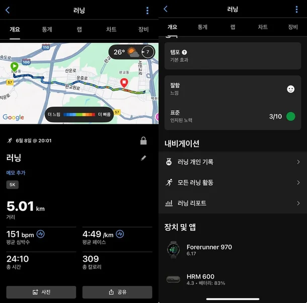 하지만 포러너 970 단독으로도 손목 심박 측정과 기본 러닝 다이내믹스는 가능합니다. 다만 고강도 훈련이나 페이스 기반 트레이닝을 정교하게 하고 싶다면 HRM-600과 함께 사용하는 것을 추천드립니다