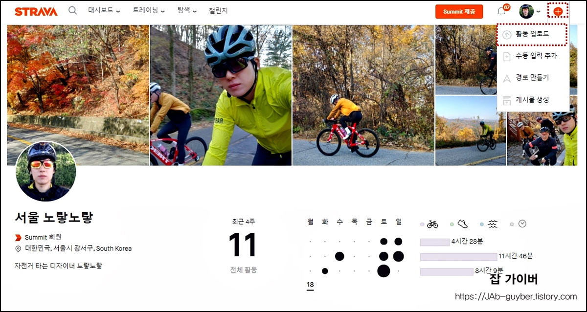 - 우측상단에 있는 + 버튼을 클릭 활동 업로드 선택