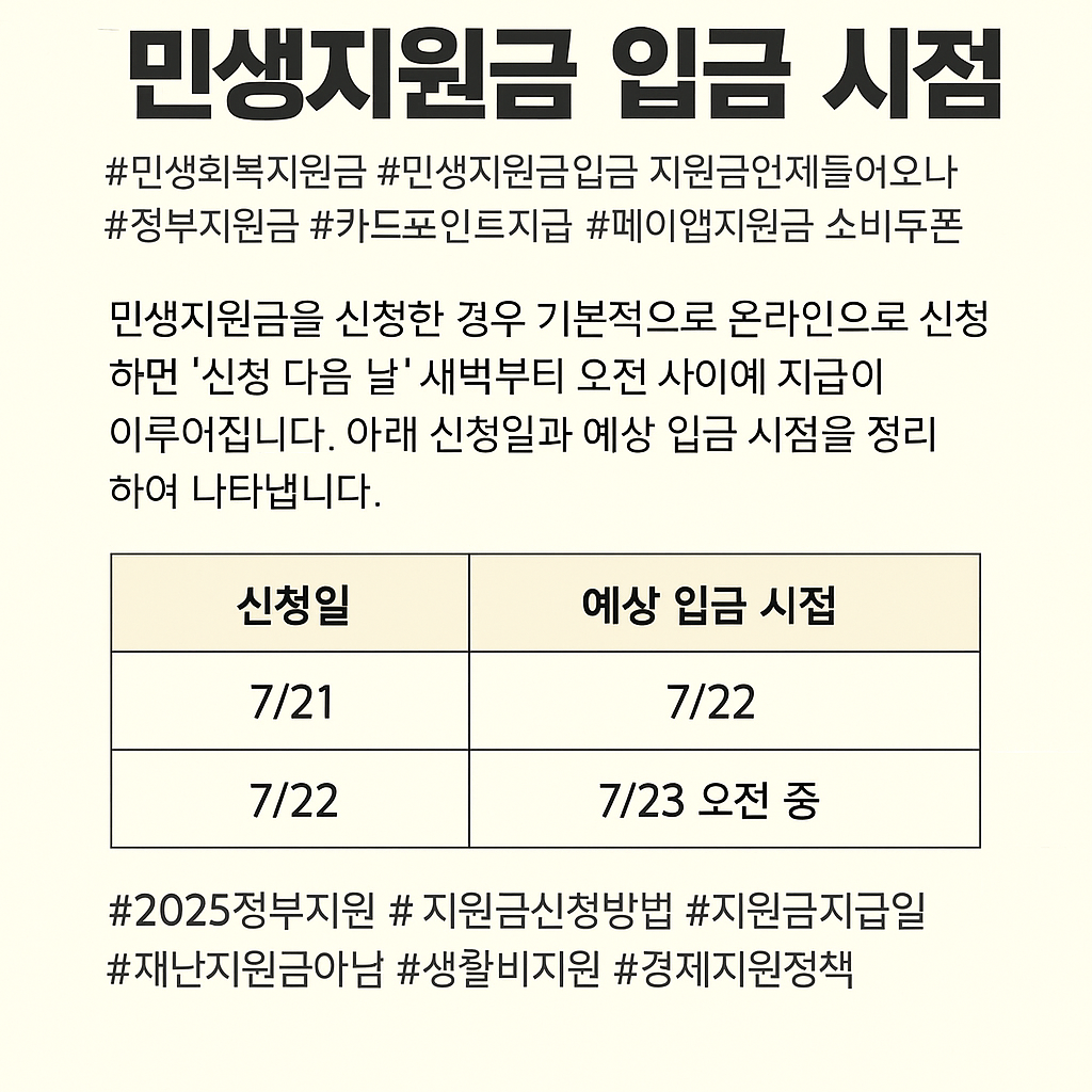 민생지원금 지급 시기를 놓치지 않기 위해서는 신청 날짜와 수령 방식에 따라 언제 입금될지를 미리 숙지하고 있어야 합니다.