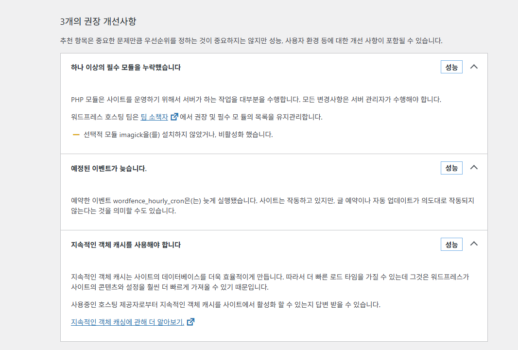 워드프레스는 단순한 블로그 플랫폼을 넘어서 다양한 기능을 품고 있는 CMS지만, 기본값 그대로 두면 의외로 많은 비효율이 누적되기 쉽다. ‘필수 모듈 누락’, ‘예약 이벤트 지연’, ‘객체 캐시 미사용’과 같은 경고는 단순한 알림이 아니라 사이트가 더 빨라지고, 더 안정적으로 운영될 수 있도록 알려주는 힌트다.