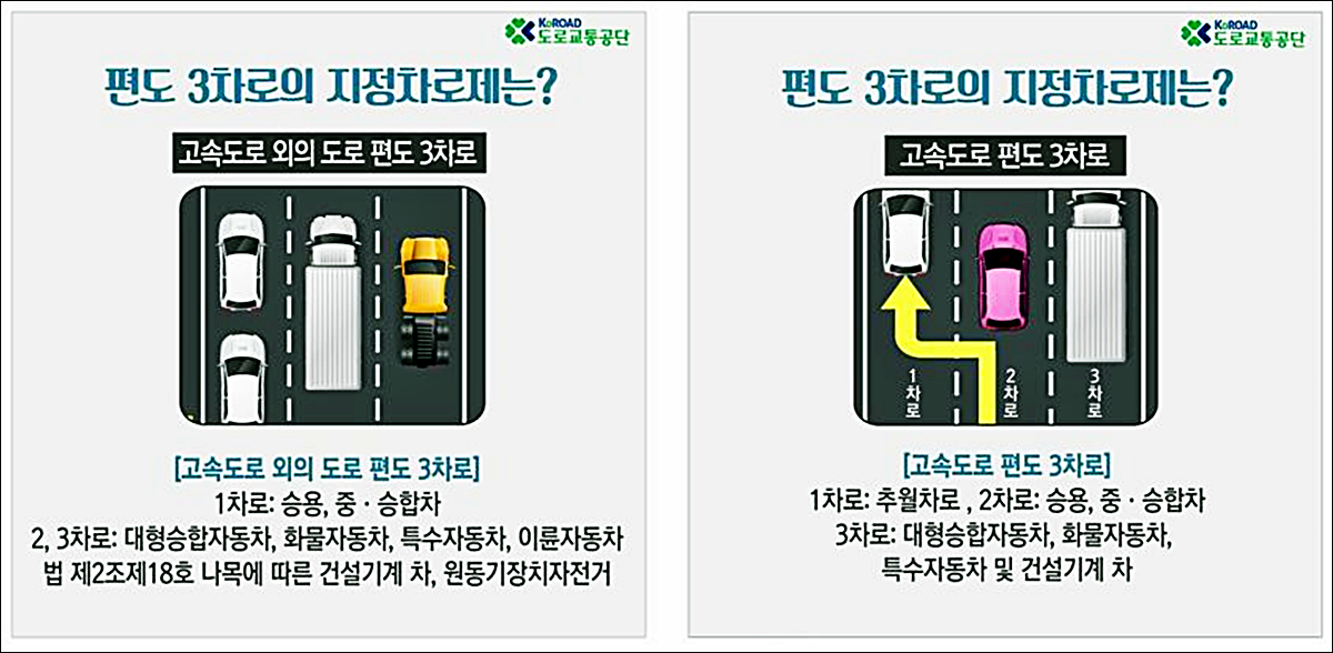 1차로 : 2차로가 주행차로인 자동차의 앞지르기 차로 2차로 : 승용자동차. 승합자동차의 주행차로 3차로 : 화물자동차, 특수자동차 및 건설기계의 주행차로 |